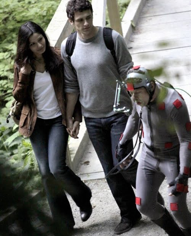 The third photo briefly popped up on line a few weeks back before Twentieth Century Fox sent out a flurry of take down notices. We’ll see how long this one lasts. It shows Serkis (Note the mini-cam rig on his head used to capture his facial performance) with James Franco and Frieda Pinto, who play scientists that helped develop the strain of intelligence apes that will one day usurp the rule of the planet from men.
