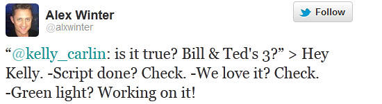 Silent until Winter tweeted a little something about the project over the weekend, that seems to indicate that there has been a small bit of progress. In response to a question from Bill & Ted co-star George Carlin’s daughter Kelly, Winter stated –
