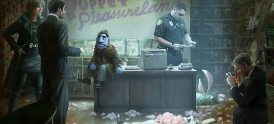The first piece of concept art is of Phil himself and shows us exactly how world weary a puppet can look. The second is from early in the film when Phil just happens to be at a grungy adult book store while investigating another case and stumbles across the first of the Happytime cast murders. As you can see, the female police detective on the far left could very well be the Heigel role. The police believe that the attack was just a robbery gone wrong, but Phil has his suspicions…