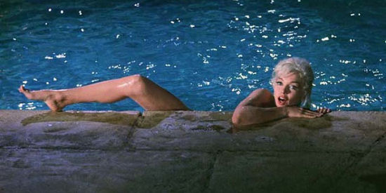 In reality, Monroe’s death came during the shooting of the film Something’s Got To Give, a remake of 1940‘s My Favorite Wife, with co-stars Dean Martin and Cyd Charisse. Monroe’s erratic behavior quickly cost in the production a million dollars in overages in just the first few weeks of shooting. The studio tried to fire Monroe and replace her with Lee Remick, but when Martin objected, the studio relented. After Monroe’s death the film was shut down, though the studio reworked the script into Move Over Darling with James Garner and Doris Day. A majority of the film that was already completed was edited together as part of the 2001 documentary Marilyn Monroe: The Final Days.