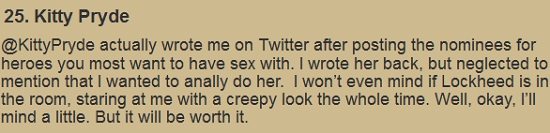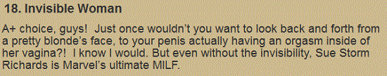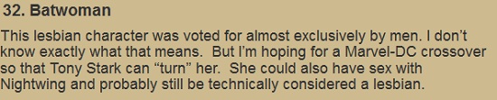 The post consists of the results of his second annual polling of his fans for the 50 superheroes, male and/or female, they’d most like to have sex with.