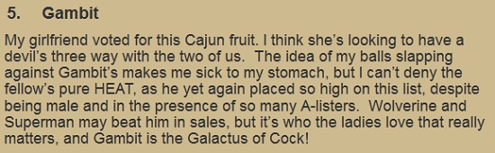 Lets be clear: there’s nothing wrong about running a poll for the most sex-able superhero on your site, especially one where you embrace the fact that Batman and Gambit come in within the top five. There isn’t anything wrong, in that context, of choosing art that sexualizes the characters in it. There isn’t even anything wrong with talking explicitly about sex in your commentary on the poll results. What’s wrong is the sheer amount of slut-shaming (on only the female characters) and anti-gay language that Gunn directs towards the majority of the male characters. These are not opinions befitting somebody who’s been given the task of bringing a major part of the Marvel Universe to the big screen (a set of characters, I might add, that includes a lesbian superhero couple, not that they’ll be appearing in Guardians).