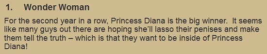But, unfortunately for Gunn, he had make comments on the entries to the list. And his comments start vulgar and get worse from there. Here is a sample, starting with the winner of the poll, Wonder Woman (WARNING: The language is crude and vulgar):