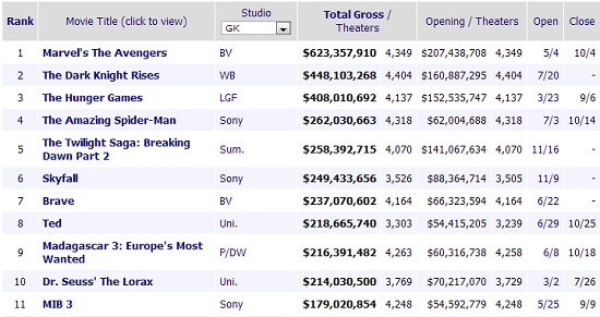 As of last night, comic book adaptations hold three of the top five spots on the yearly highest grossing films list. I’m sure Skyfall and the aforementioned Breaking Dawn, Part 2 might have some say if The Amazing Spider-Man stays in the Top 5, but even if it does fall out, we will have three comic book adaptations in the Top 10. And that has never happened. The closest we came to that was in 2008 when The Dark Knight and Iron Man were one and two and the original superhero comedy Hancock was number four. Add to that the fact that a sequel to another comic book adaptation, Men in Black 3, was #11 this year and you have a very good year for the comic book film.
