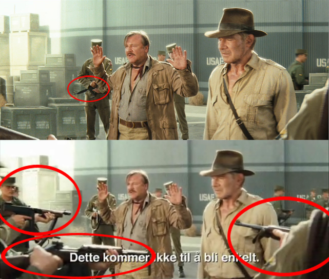 This is not the first time that promotional material has been altered to tone down a potentially violent image. A trailer for Indiana Jones And The Kingdom Of The Crystal Skull had a shot where Indy (Harrison Ford) and Mac (Ray Winstone) are surrounded by Soviet soldiers yet their weapons are non-existent in the trailer and yet are on full view in the actual film.