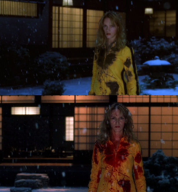 Something similar happened in the trailer for Quentin Tarantino’s Kill Bill Vol. 1, where blood on Uma Thurman’s yellow track suit was digitally darkened to brown to look more like dirt than the bright red stains that are visible in the film.